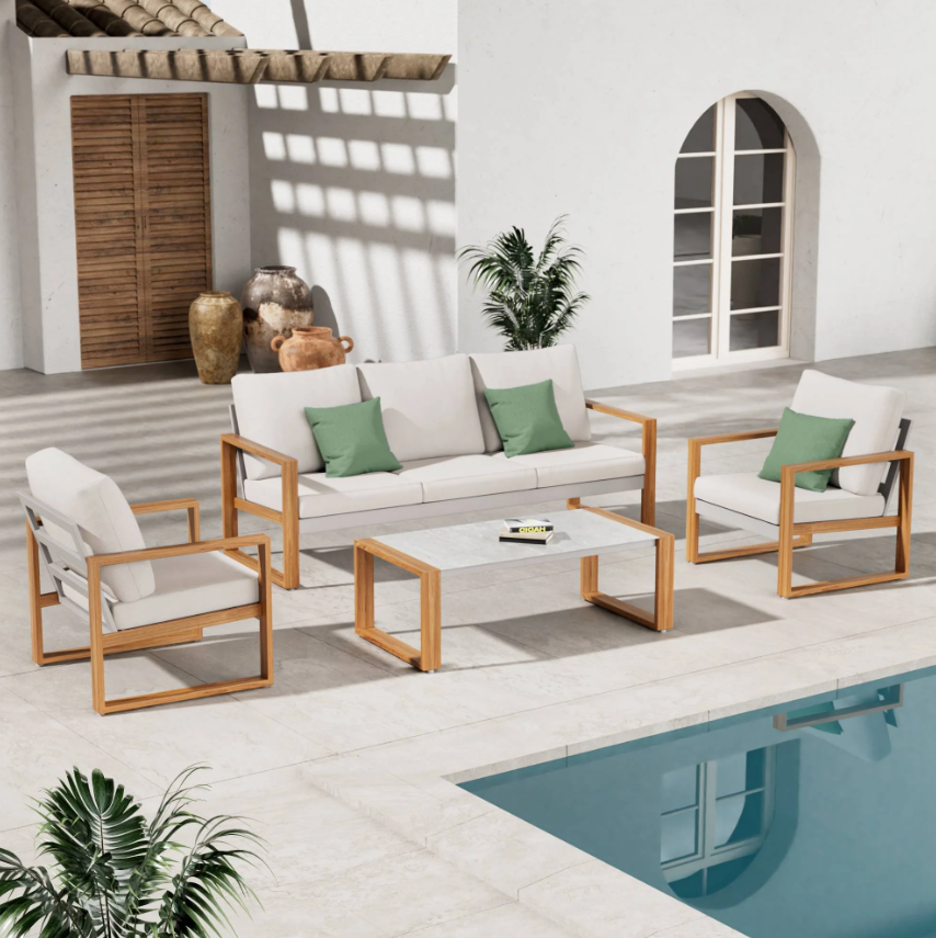 EVERITE Outdoor 4 Pieces Steel Conversation Set ,Faux Wood Grain Finish Frame Sofa,$1199.99